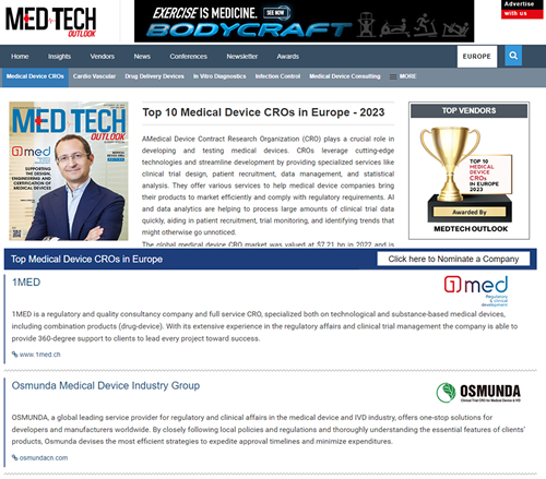 ● 國(guó)際權(quán)威醫(yī)療科技雜志MedTech Outlook評(píng)選為歐洲十大醫(yī)療器械CRO之一